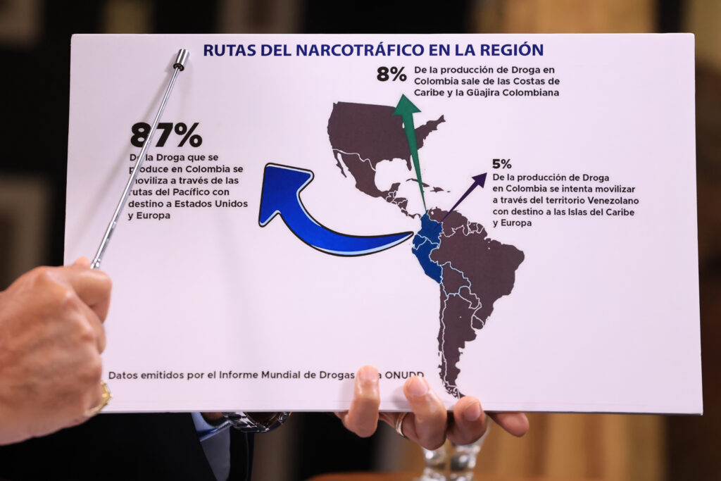 El mapa expuesto por el Jefe de Estado mostró cómo el 87% de la cocaína que se produce en Colombia sale por el Pacífico, el 8% por el norte de la Guajira colombiana y solo un 5% intenta pasar por Venezuela. «De ese 5%, nosotros, creo que son más de 100 toneladas, 5%, nosotros logramos incautar y destruir más del 70%, cifras oficiales de la Organización Mundial de Lucha contra el Narcótico», detalló el presidente Maduro, a través del gráfico.