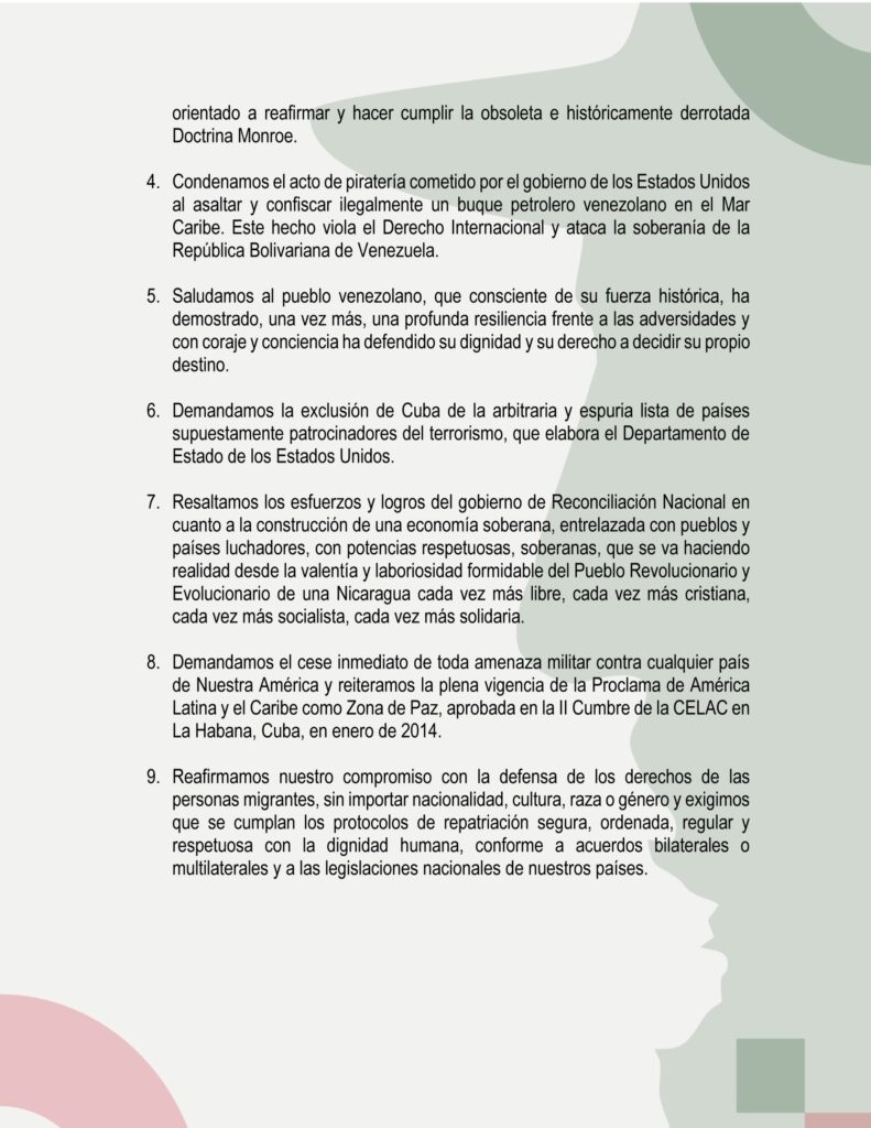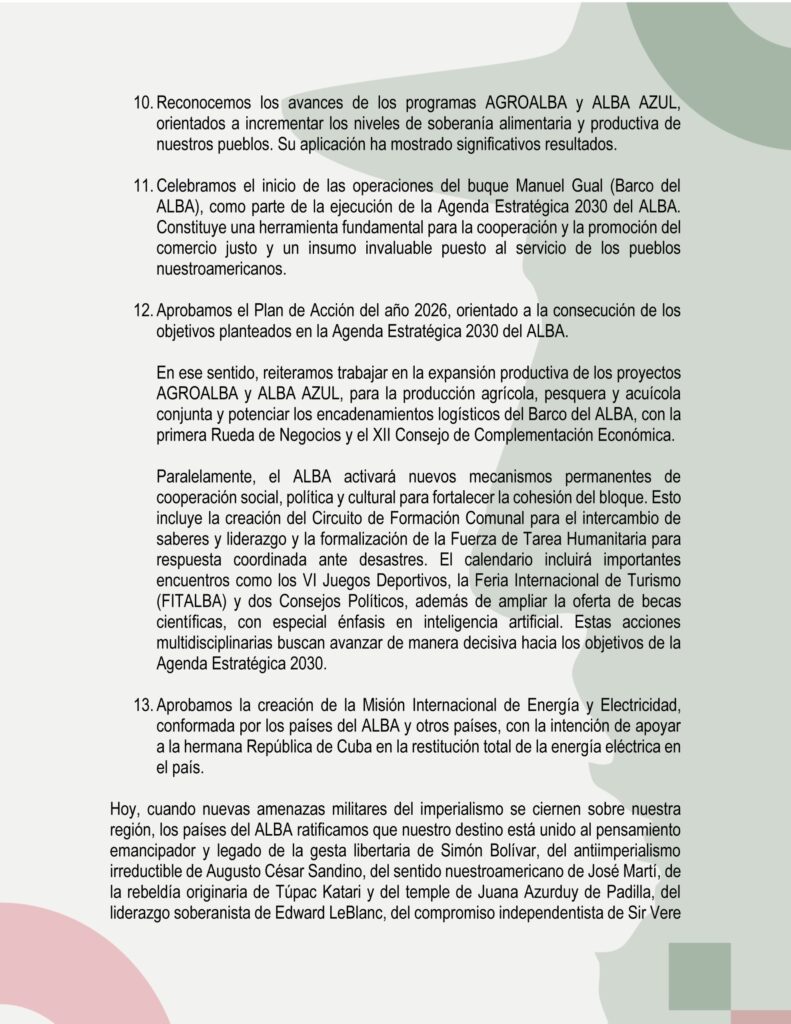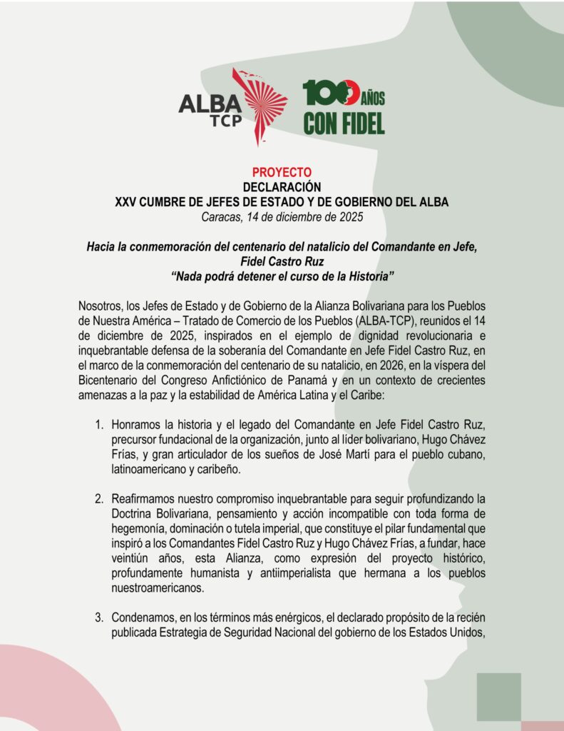 A continuación, la DECLARACIÓN XXV CUMBRE DE JEFES DE ESTADOS Y DE GOBIERNO DEL ALBA: