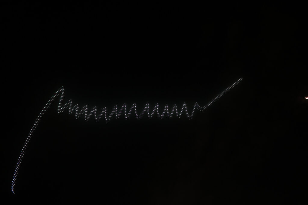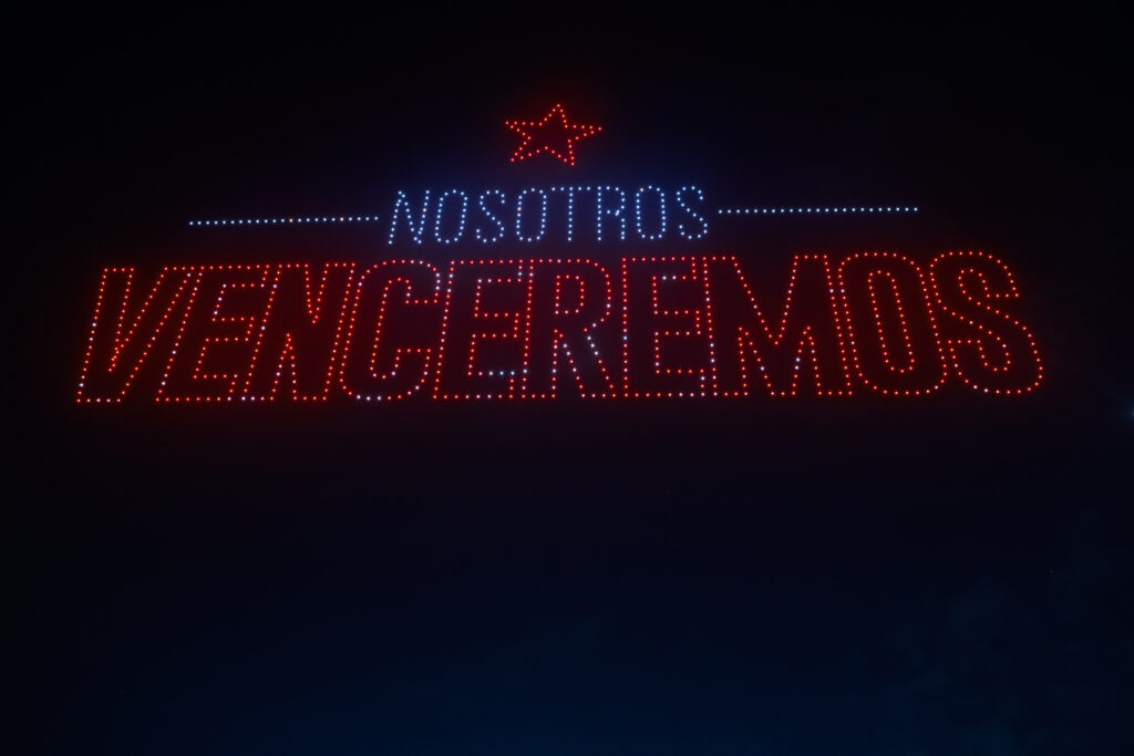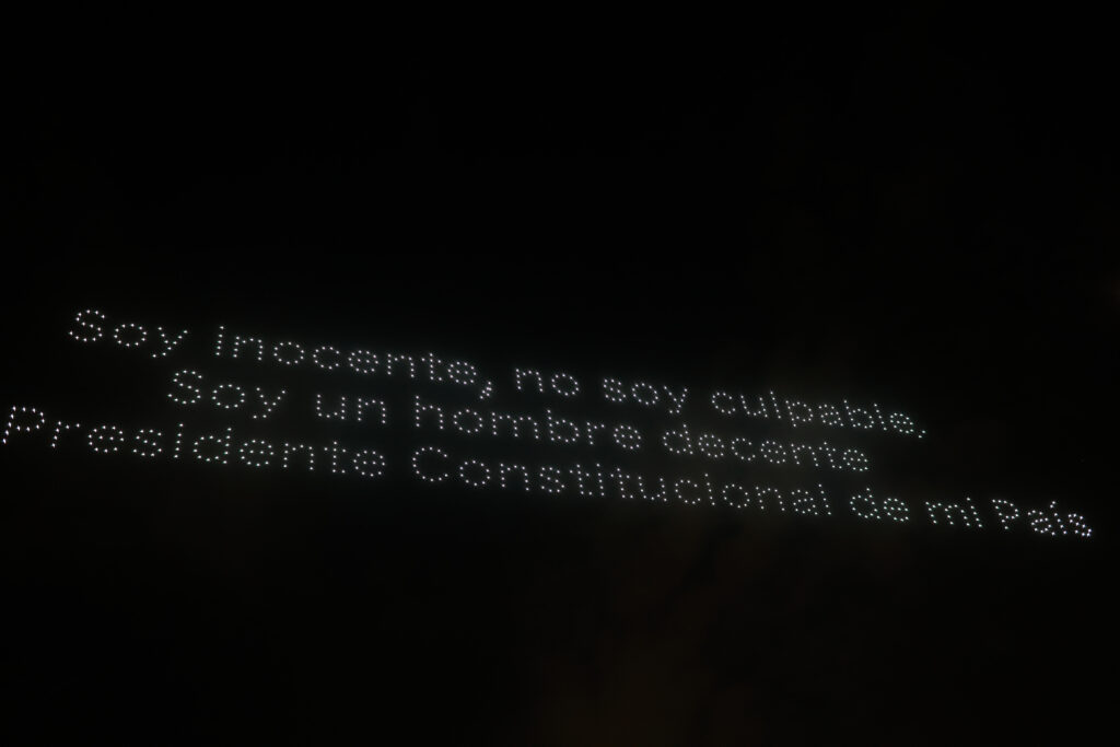 Durante el espectáculo, las luces formaron mensajes de lealtad y la emblemática firma del mandatario, destacando su firmeza como presidente constitucional.