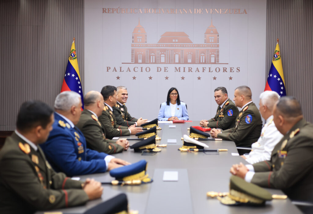 Palacio de Miraflores, Caracas.- La presidenta Encargada de la República Bolivariana de Venezuela, Delcy Rodríguez, sostuvo este jueves un encuentro con el G/J Vladimir Padrino López y el Alto Mando Militar en el Palacio de Miraflores.