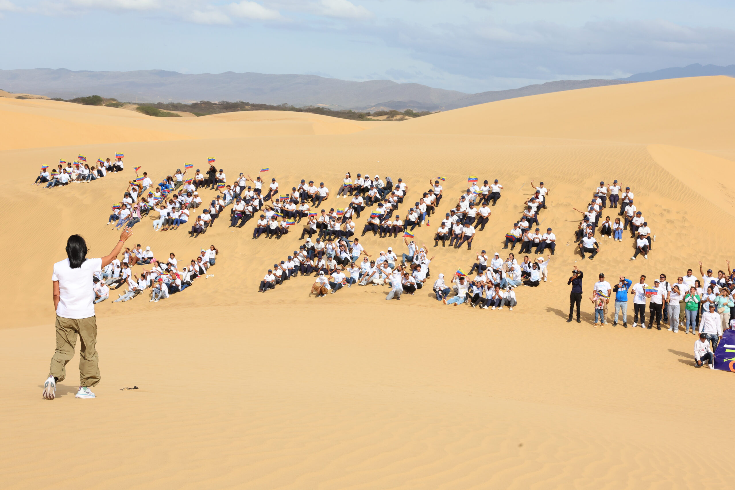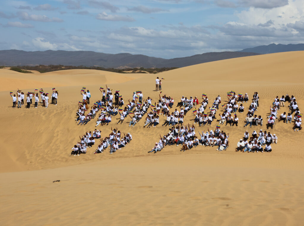 Estado Falcón, Venezuela. – La presidenta encargada de la República Bolivariana de Venezuela, Delcy Rodríguez, se unió este martes, a pizarra humana en los Médanos de Coro para expresar que «Venezuela en Paz».